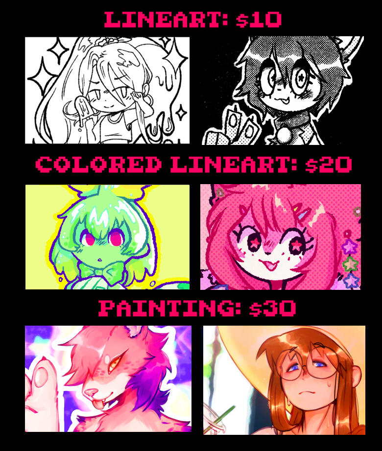 mech (to a degree), & sometimes real people (As in I won't draw the beatles or something but will draw you or your gf or smth).- EXTRA characters will increase the price depending on complexity of said character(s)- I TEND to not send WIPs and screenshots. I do my commissions (and all my art in general) all in one sitting, so i tend to forget. If you would like progress shots sent to you, let me know. I can try to include a speedpaint as well upon request- 3D pictures vary in price depending on complexity of character. I will not be using Paint3D for commissions anymore.- I have the right to refuse a commission if i do not feel comfortable doing so.